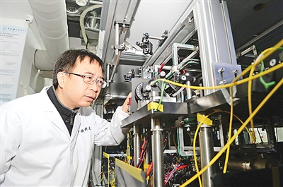 在中國科大量子存儲實驗室內(nèi),潘建偉在了解科研情況。